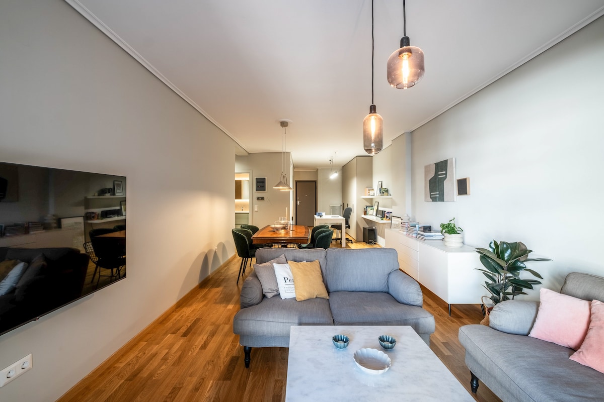 Experience Athens in unparalleled luxury from a spacious apartment, where every room is a window to history! Marvel at the Acropolis from an expansive living area, featuring dual sofa lounges, dining spaces, and a balcony that invites the cityscape. Perfect for professionals, a vast workspace boasts high-speed internet and inspiring panoramic views. Indulge in a modern kitchen, 2 bathrooms, and a sunny bedroom with a queen bed. Embrace the blend of comfort and history in this Athenian retreat!