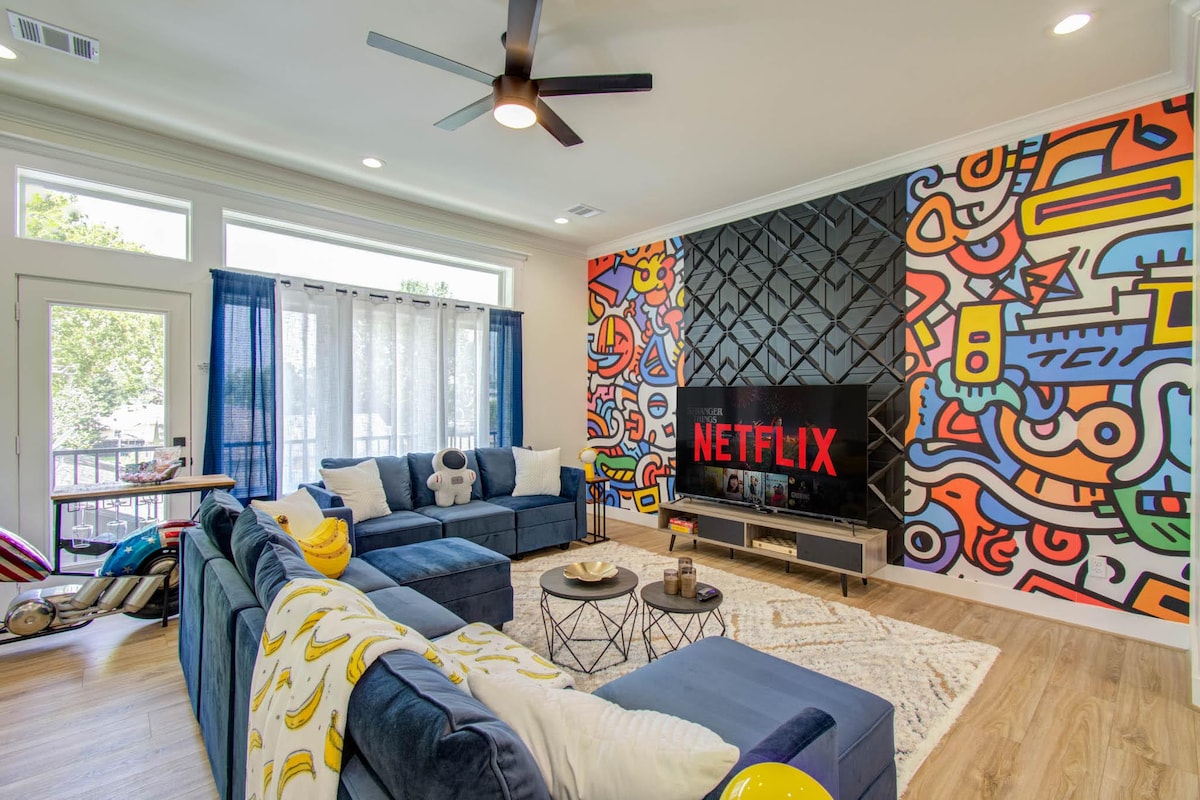 Casa limpia, hermosa decoración, obras de arte originales, estacionamiento cerrado/EV, ubicación central del distrito artístico, wifi rápido. Disfruta de una comodidad de lujo en una ubicación céntrica cerca del centro de Houston. • A 5 minutos en auto del centro de la ciudad • A 10 minutos de Galleria. • A 15 minutos del distrito médico. • Entrada cerrada - Cocina completa con utensilios de cocina. • Cuna/trona. • Internet rápido de 1 Gb/s. • YouTube TV con ESPN, NFL Network, CNN, Univision • Televisión de 65pulgadas en la sala de estar y TV en cada habitación. - Artículos de tocador de cortesía • Ducha con efecto de lluvia “baños de spa”