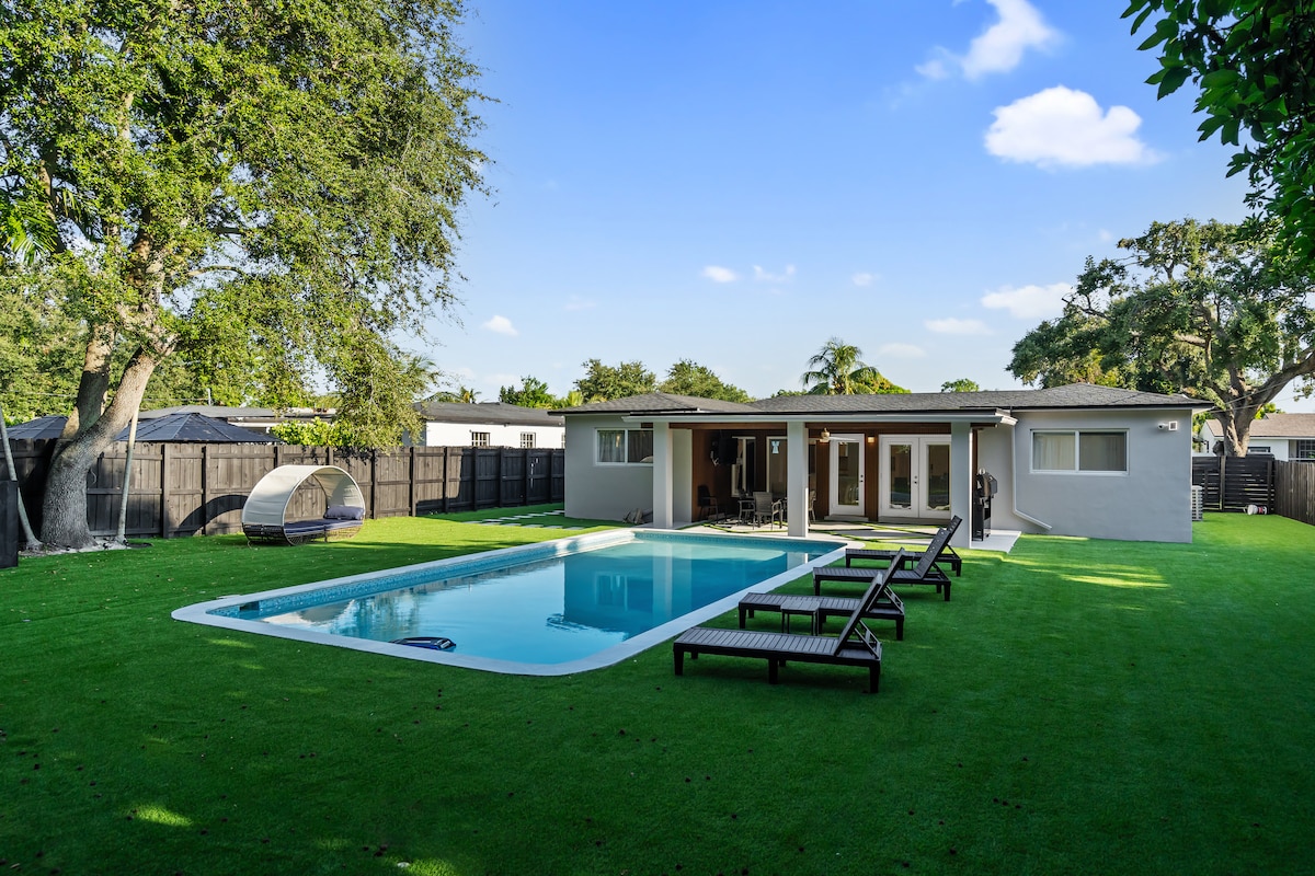 Elegante casa tropical de Miami con piscina climatizada, columpio, juegos de mesa, juguetes para niños, barbacoa de carbón y mucha vegetación. Cocina de alta gama bien equipada de acero inoxidable + cuarzo. Los árboles de mango y las velas dan mucha sombra. Valla de la piscina por solicitud. Escritorio de trabajo remoto + buena conexión wifi. Cerca del centro comercial Aventura y la playa Sunny Isles. A minutos del estadio Hard Rock. *Piscina climatizada a 86 grados del 1 de noviembre al 1 de mayo (durante el día). No SE PERMITE CELEBRAR FIESTAS: cámaras en el exterior.
