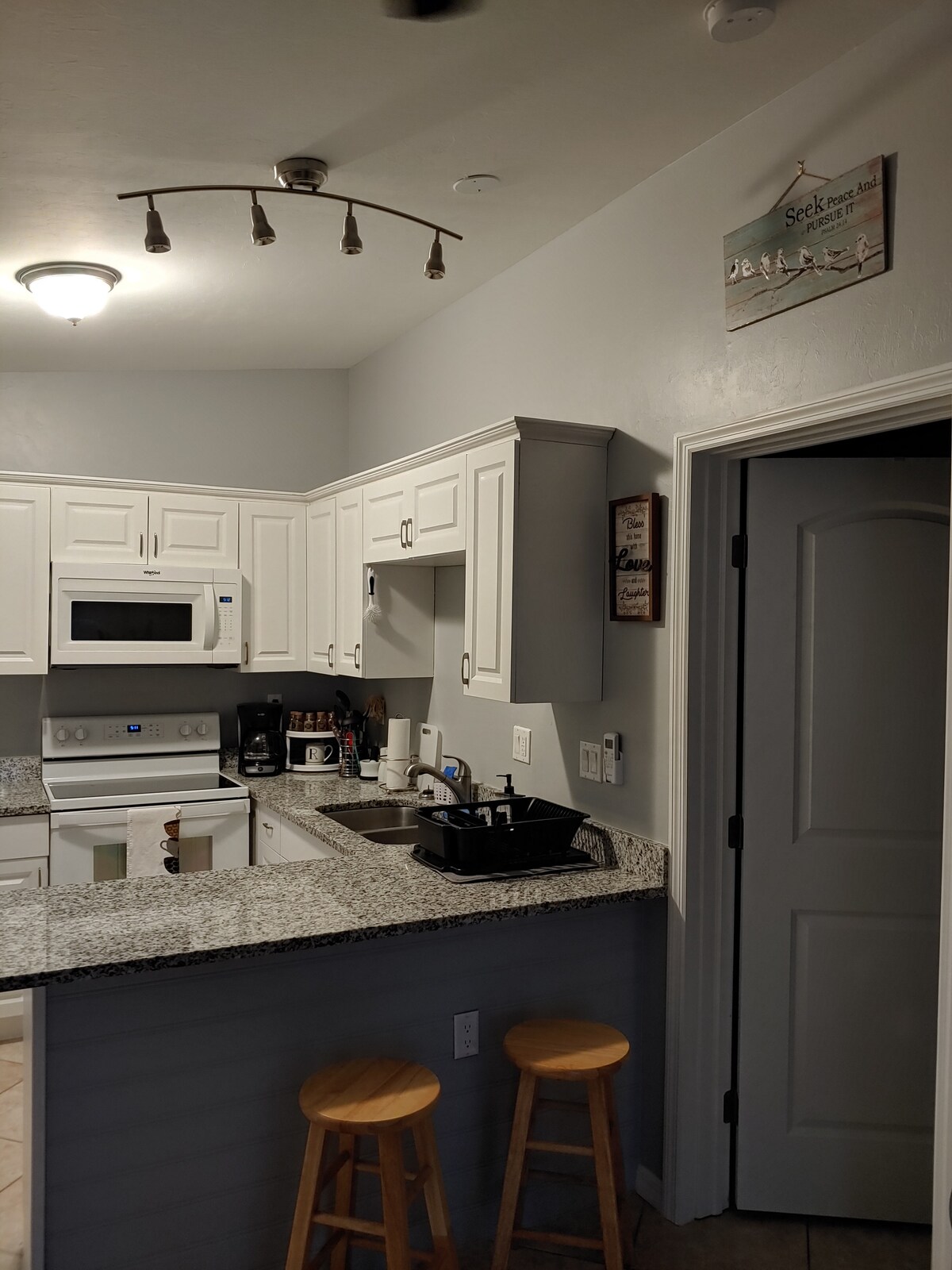 ¡Hermoso loft de nueva construcción que ofrece 640 pies cuadrados de planta abierta! Esta unidad se encuentra encima de nuestro garaje para dos coches, a 130 pies de la casa principal. ¡Cocina completa, microondas, cafetera, tostadora, plancha y lavadora/secadora! Nuestra casa se encuentra en 1,14 acres con una entrada circular en un barrio muy tranquilo. Disfruta de huevos frescos de granja orgánica cuando las gallinas estén poniendo. Si tienes hijos, puedes jugar en la «isla» (nuestra zona de juegos para niños) con una casa de juegos y una cúpula para escalar. ¡Un lugar muy relajante!