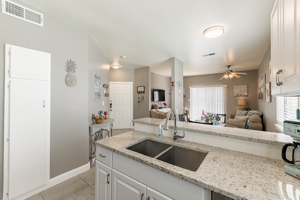 ¡Hermoso loft estudio con magníficas vistas al agua! Comienza y termina el día con tu bebida favorita en el patio privado con vistas al canal más ancho de la isla. ¡Disfruta de tu tiempo en la zona de la piscina, pesca algo en la terraza o admira la puesta de sol mientras asas la cena! Aparca tu barco en uno de los amarres o deja que tus hijos aprovechen el gran parque que hay al final de la calle. ¿Necesitas unas vacaciones en la playa? Carga el coche o alquila un carrito de golf y haz el viaje de 5 minutos hasta Whitecap.