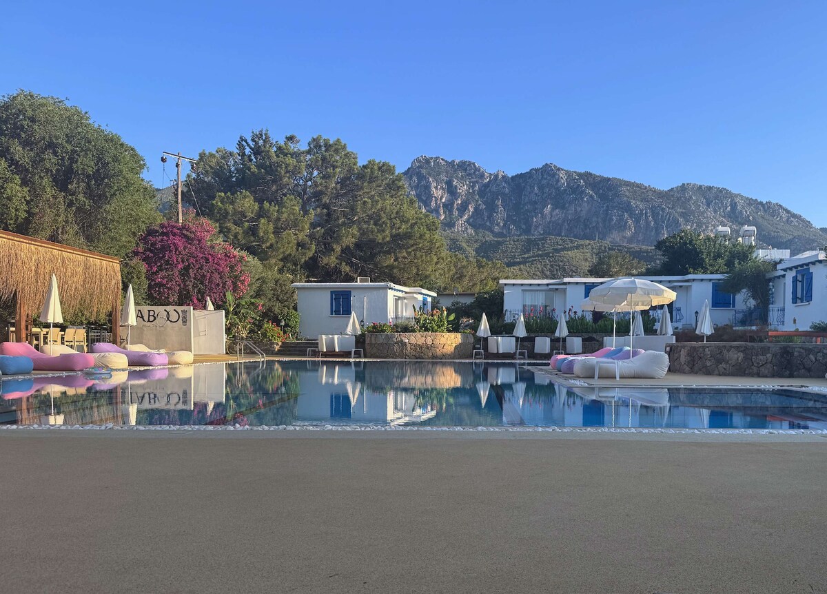 Escape to a tranquil bungalow nestled at the foot of the mountains in Alsancak, offering stunning views and a refreshing escape. This charming one-bedroom retreat features a bright living area with a sofa bed and TV, a modern bathroom, and a serene bedroom with a double bed. Enjoy the convenience of a communal pool, free Wi-Fi, and essential amenities for a truly relaxing stay. Explore nearby attractions or simply unwind in your peaceful haven.