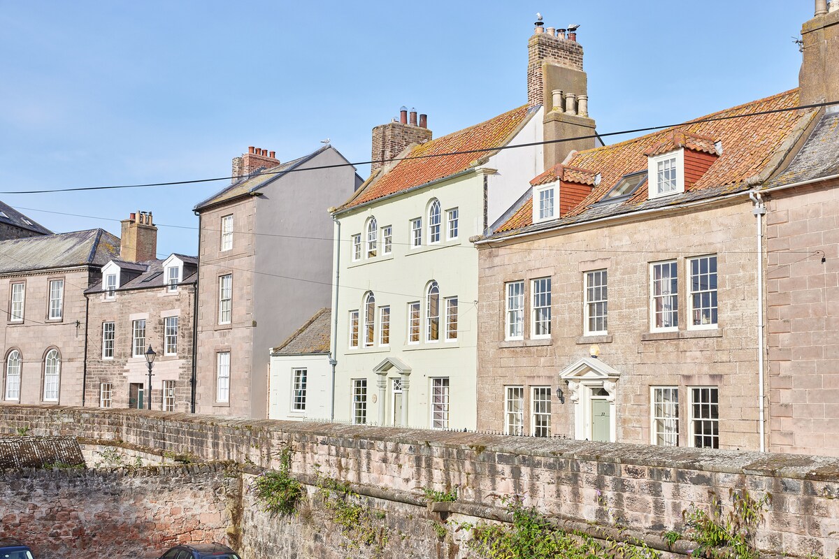 Spacious and tranquil 5 bedroom, 5 bathroom Georgian family home located within the historical walls of Berwick-upon-Tweed and is within walking distance of all the town's history. Kitted to the highest standard whilst keeping its original features, it is a perfect oasis for a family trip, reunion or a group of friends exploring the area. It features a freestanding bathtub in the main bedroom, a private terraced garden with a fire pit, and smart TVs in every room. It is family and dog friendly.
