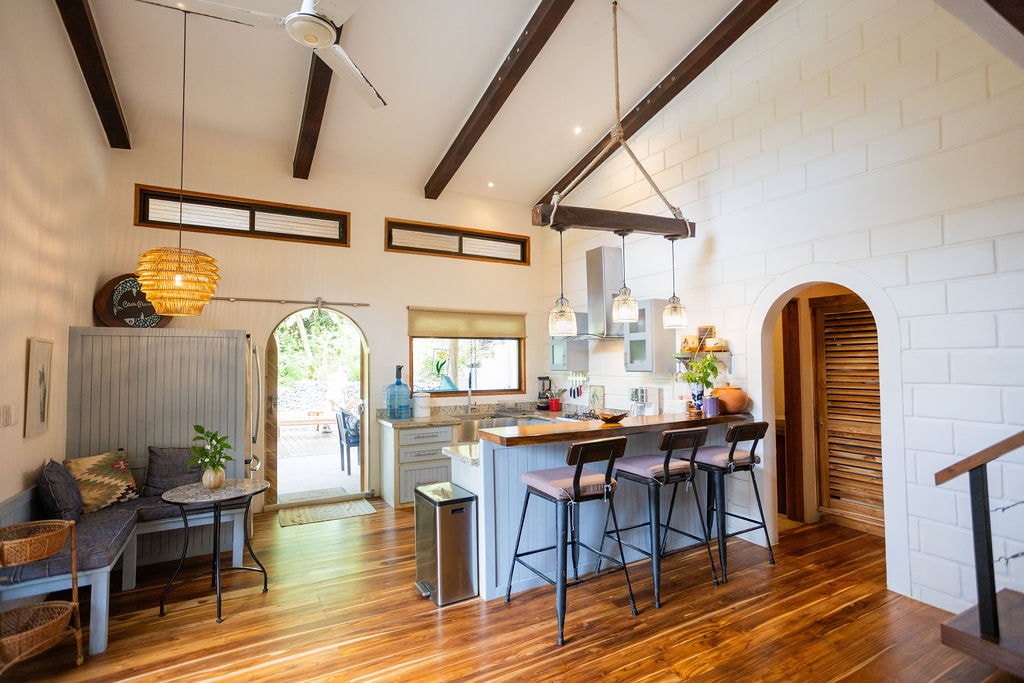 Alojamiento sencillo con servicios modernos. A poca distancia a pie de la playa de Guiones y Bodhi Tree. La casa tiene una cocina completa, una cómoda cama tamaño king, múltiples unidades de aire acondicionado, agua caliente, wifi de fibra óptica (300 mbps), un nuevo sofá cómodo y un escritorio para trabajar. Trabaja desde casa, acude a clase de yoga en Bodhi o disfruta de las olas con tu café de la mañana. Un alojamiento perfecto para disfrutar de Guiones.