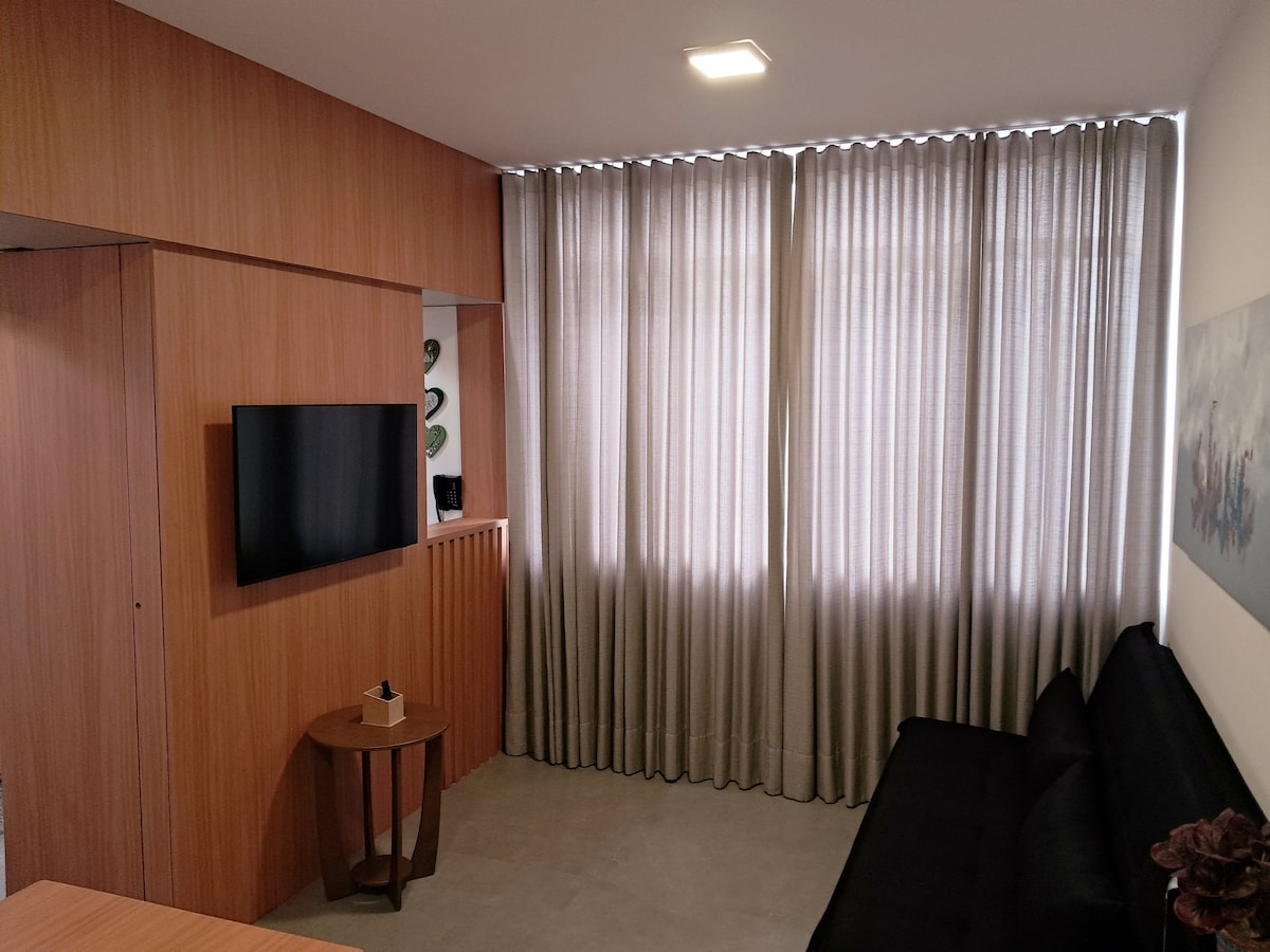 Com 70 m2 , para quem quer privacidade e independência . Na Savassi à duas quadras da Praça da liberdade e do Shopping Pátio Savassi. Com uma suíte, banho reversivel social , sofa cama para hospedes, janela da suíte antiruídos, ar condicionado quarto e sala, wifi300 megas, smartv de 75 polegadas , Hometheater, cozinha completa , microondas, serviço de quarto, camareira, manobrista, piscina , academia, sauna, restaurante e portaria 24horas.