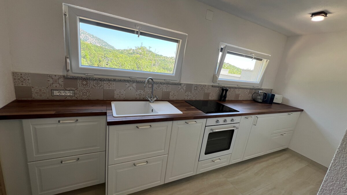 Departamento recientemente renovado en una antigua casa de piedra, cuidadosamente amueblada con muebles de diseño originales de los años 70 y 80. Amplia zona al aire libre con vistas a la montaña, perfecta para relajarse. Se puede llegar al mar a través de la antigua carretera de María Theresia en 15 minutos a pie, en coche en menos de 10 minutos. Ideal para aquellos que aprecian el estilo, la tranquilidad y la naturaleza. Aire acondicionado disponible (¡calefacción en invierno!)