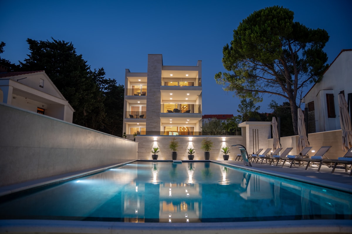 En las colinas de Stara Novalja, un amplio apartamento con 3 dormitorios, sala de estar con una gran televisión inteligente, cocina completa con salida a la terraza, comedor, armario, 2 baños completos y una gran terraza con salón. Puede alojar cómodamente a 8-10 personas. Hay una enorme piscina privada con solárium a solo un paso del apartamento, así como una parrilla y un estacionamiento privado. Está a unos 5 minutos en coche del centro de la ciudad de Novalja y a 10 minutos en auto de Zrce Beach. ¡Servicio de taxi y traslado disponible!