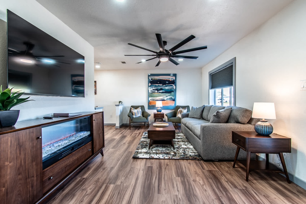 Disfruta de una experiencia de lujo en este céntrico alojamiento, The Texas Pearl. Aquí encontrarás una cama tamaño king, acompañada de dos camas tamaño queen con colchones de espuma viscoelástica de 10 pulgadas. Sistema de sonido de última generación que cuenta con (4) altavoces de techo, la galardonada barra de sonido Sonos Arc, (2) Sonos Play 5 y (2) subwoofers. Conectado para tu visualización está el LG OLED Evo. Estamos seguros de que disfrutarás de tu experiencia de cine en casa. Barra de café con cafetera de filtro, cafetera de cápsulas y cafetera expreso.