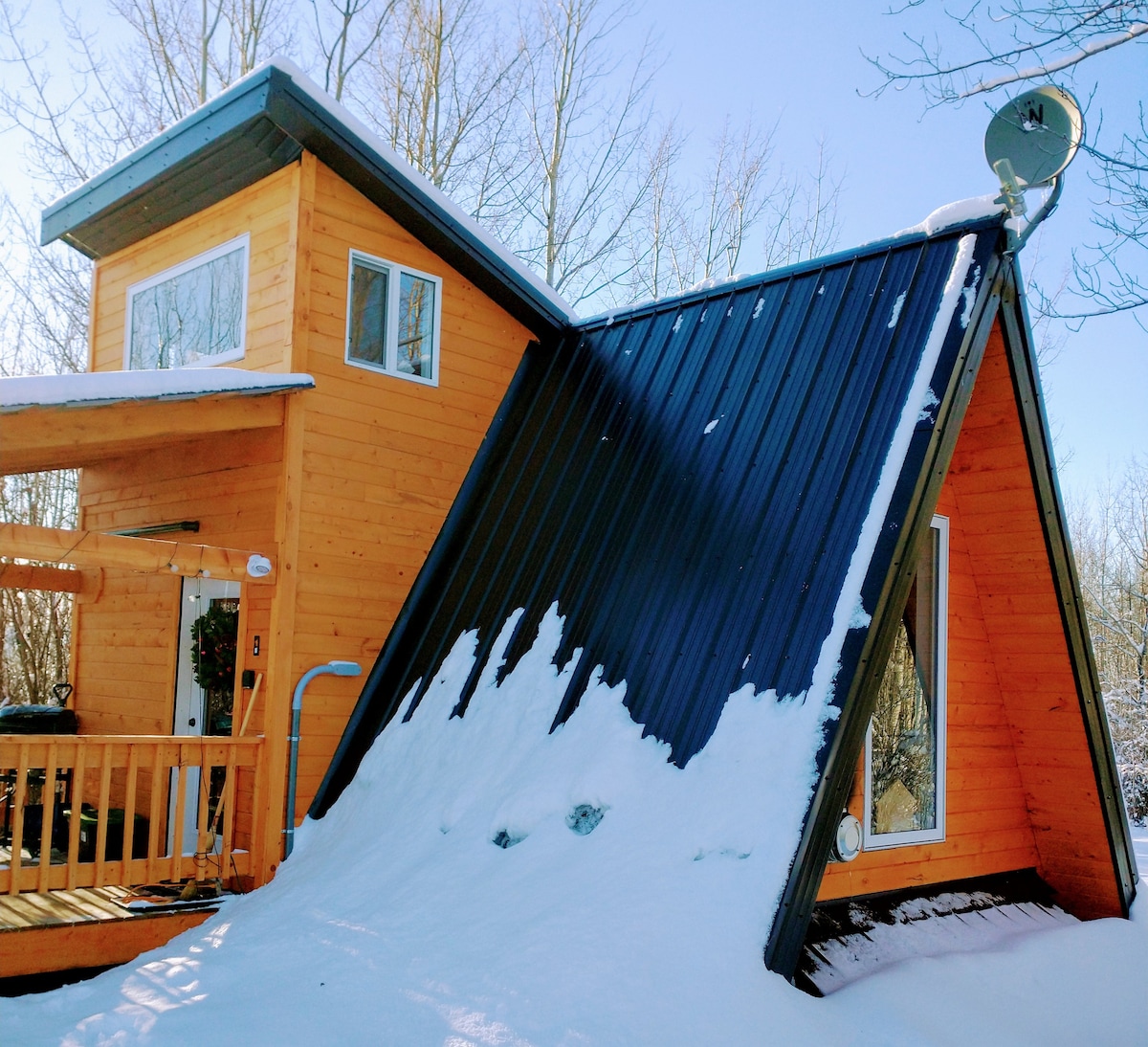 ¡Pequeña cabaña aislada con estructura en A y chimenea exterior!
