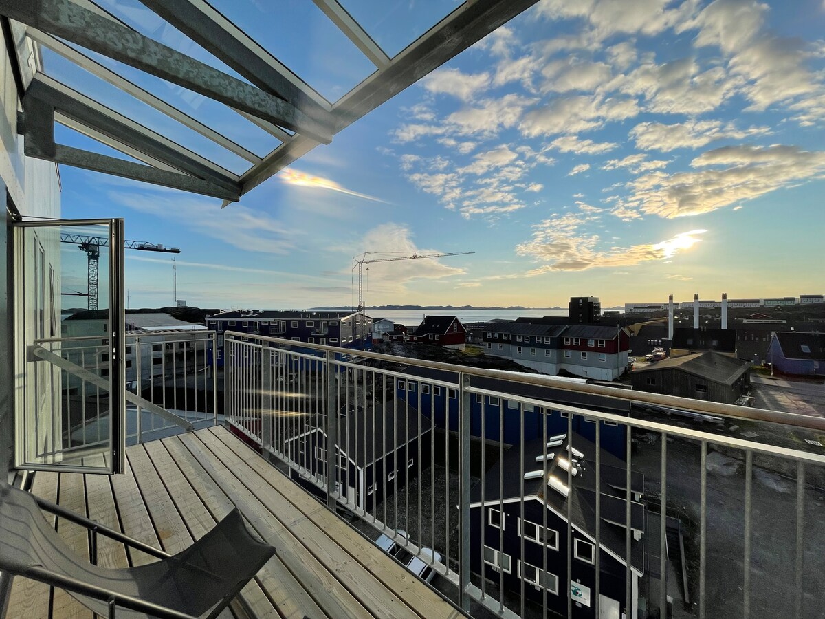 El apartamento está situado en el centro de Nuuk con vistas al mar hacia el fiordo y el antiguo puerto de Koloni, desde donde navegan los barcos turísticos. A 5 minutos a pie del centro de la ciudad, museos, paradas de autobús, casa cultural, iglesia, oficina de correos, centro comercial, restaurantes y cafés. El departamento está en el quinto piso con ascensor. ¡El departamento tiene cocina, sala de estar, baño y 2 dormitorios (2 camas x 200x180) y está totalmente equipado con todo lo necesario! El espacio es ideal para parejas, parejas de amigos, familiares o viajeros por trabajo.