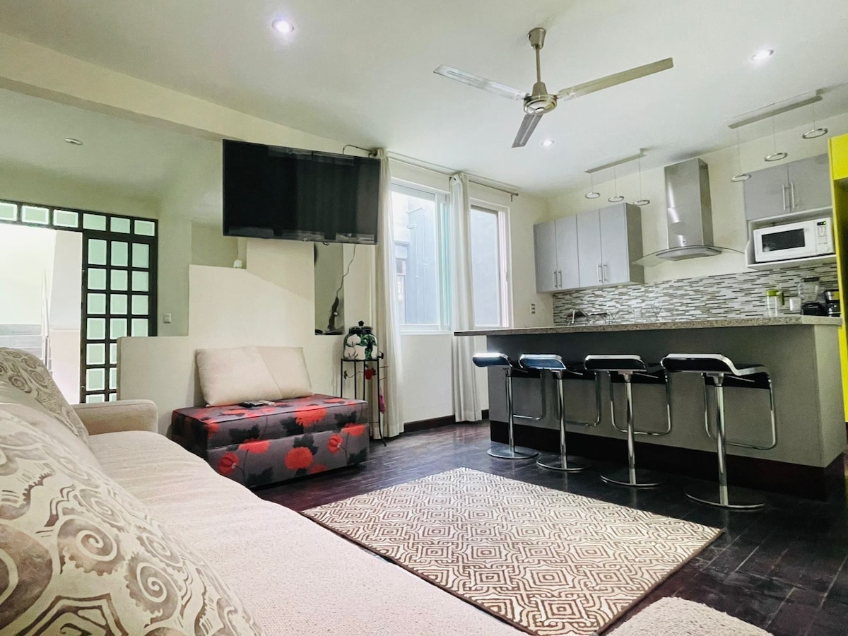 Disfrutarás cada momento en este acogedor departamento amueblado de una habitación, baño propio, cocina, sala y barra comedor, además todos los servicios ,wifi y café, ubicado en el centro de Oaxaca, tendrás acceso a la alberca en areas compartidas ¡Vive la experiencia de vivir en el centro histórico con todas las comodidades! Este departamento se encuentra dentro de hostal familiar, tiene su propia puerta de entrada. Para 2 personas 1 cama king size para 3 personas se agrega una cama individual