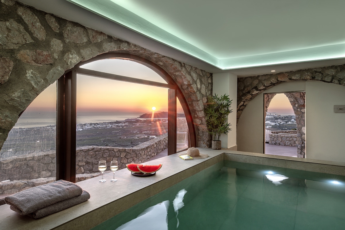 Habitación cueva con piscina al aire libre y vistas a la caldera
