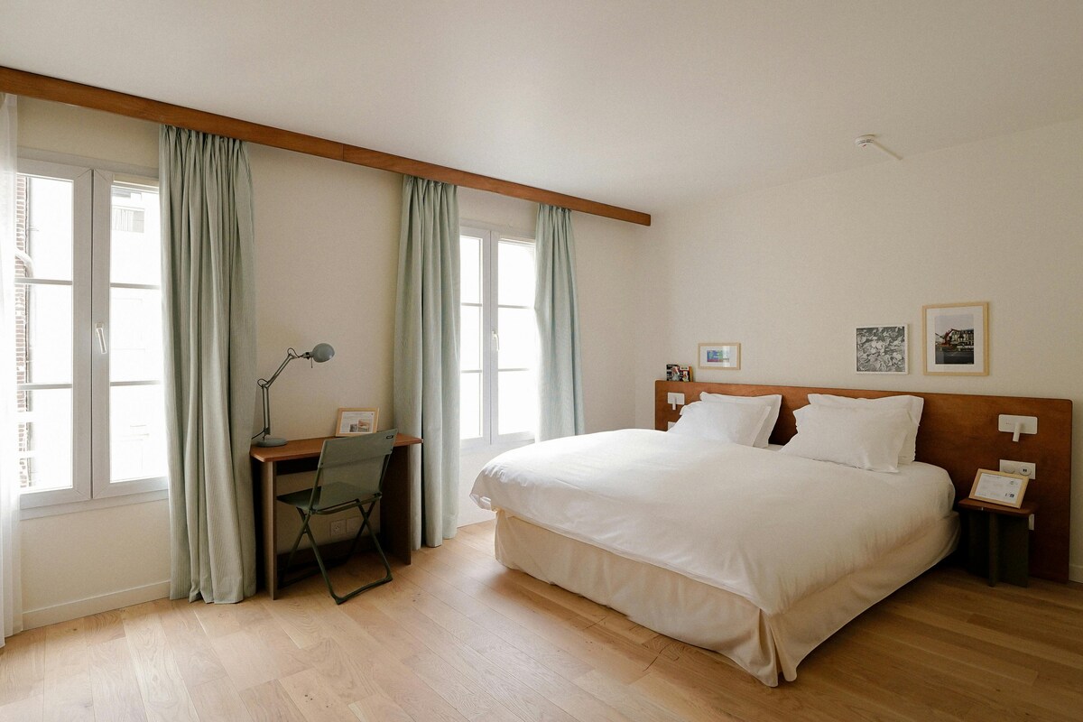 Vous adorerez le décor élégant de cet hébergement de charme. Cette chambre avec un grand lit double est équipée d'une kitchenette avec cafetière, plaque de cuisson, micro-onde, bouilloire. L'immeuble a été rénové au printemps 2024. Toutes les chambre sont équipée d'une grande salle de douche. L'hôtel se situe en face de la gare l'Isle-Adam - Parmain. Elle dessert la gare du Nord de Paris en 45 minutes.