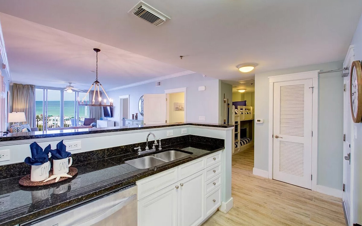 [nuevos muebles de patio] Destin West Resort Gulfside 405 (a 2 minutos de la playa y la piscina) ~ 1 dormitorio + 1 litera con 2 baños completos, capacidad para 6 personas. ~ Excelentes vistas al mar. ~ Servicio de playa gratuito: 2 sillas y 1 sombrilla (temporada: 1/3 - 31/10, 9:00-17:00 h). ~ 1 dormitorio tamaño king con baño privado. ~ 1 litera (2 camas individuales, cada una con su propio televisor) con baño privado. ~ 1 cama plegable queen ~ parque infantil portátil ~ 4 televisores inteligentes ~ Cocina completa equipada con utensilios de cocina (Keurig y cafetera tradicional). ~ Lavadora/secadora