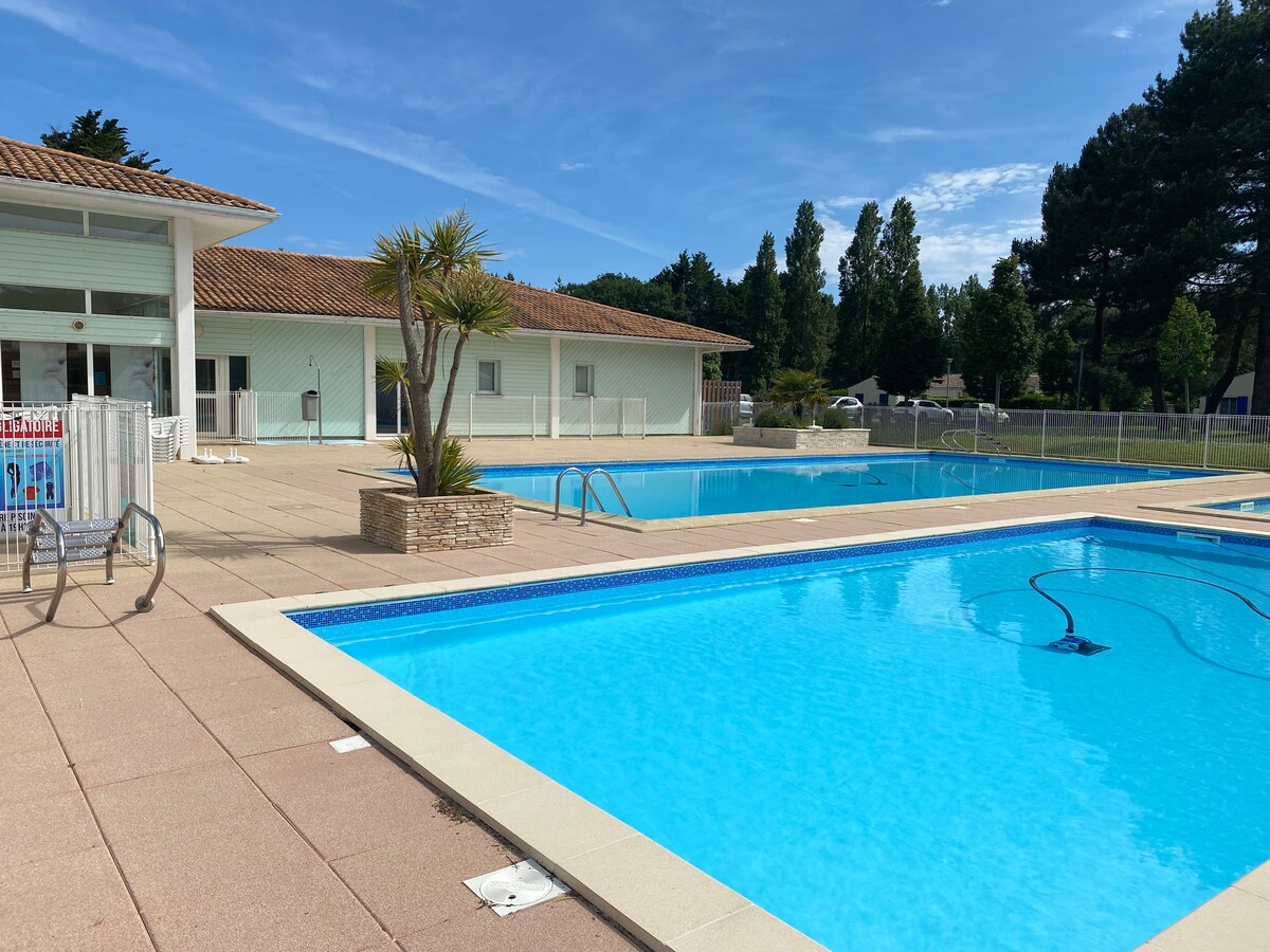 En una residencia con piscinas, venga a disfrutar de este alojamiento situado en un parque arbolado. Esta casa consta de una cocina abierta a una sala de estar equipada con TV y un sofá cama, 2 dormitorios, un baño y un aseo. Tiene una terraza privada sin vecinos con muebles de jardín. La proximidad de los carriles bici permite llegar rápidamente al centro y a la playa situada a 2 KM. Las piscinas están abiertas del 31 de mayo al 30 de septiembre de 9:00 a 19:30.