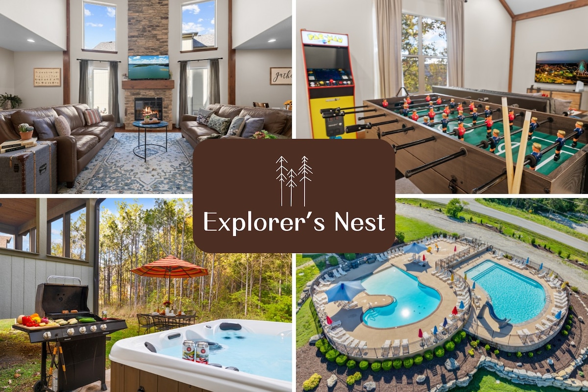 Spacious Branson Canyon lodge for up to 19 guests plus little kids. Enjoy a year-round private hot tub, seasonal 2-level pool with splash pad, and a game room with pool table, arcade & more. Multiple decks with Ozark Mountain views, large kitchen, and dining for big groups. Just minutes to Table Rock Lake, Branson Landing, golf, and Silver Dollar City. Perfect for family reunions, multi-family getaways, and retreats.