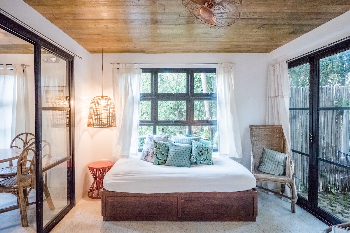 Entra en una acogedora sala de estar, separada de la cocina por un encantador bar. Desliza la puerta hacia el patio lateral para disfrutar de un relajante baño en la bañera al aire libre o cenar bajo las estrellas. Casa de 40 metros cuadrados, a 45 minutos del aeropuerto de Clark, a 20 minutos del centro comercial, a 15 minutos de las playas. >Camas cómodas >Se admiten mascotas. > Desayuno autoservicio > ¡Monos! > Porche vallado > Vista al bosque >Wifi >Agua caliente >Netflix. >Aire acondicionado >Desayuno >Cocina > Bañera al aire libre >Hamaca > Acceso a la piscina por una tarifa >Descuentos para más de 2 noches