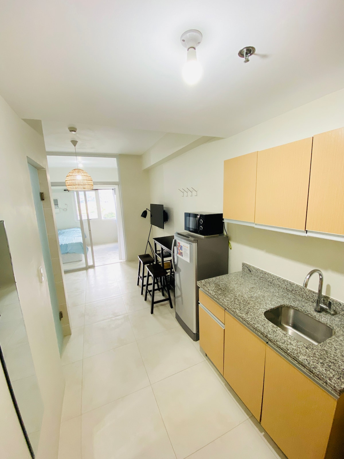 Nuestro alojamiento es una unidad de 1 dormitorio totalmente amueblada ubicada en Sundance Residences, justo en el centro de la ciudad de Cebú. Este lugar cálido y acogedor da la bienvenida y hace que la estancia de los huéspedes sea inolvidable y cómoda. Nuestro alojamiento está amueblado con los elementos básicos para una estancia agradable, como calentador de agua de ducha, nevera, cocina de inducción y hervidor de agua, utensilios para comer y cocinar, arrocera, microondas y dispensador de agua con 1 galón de recarga gratuita. También ofrecemos wifi ilimitado con 85 canales de televisión Cignal.