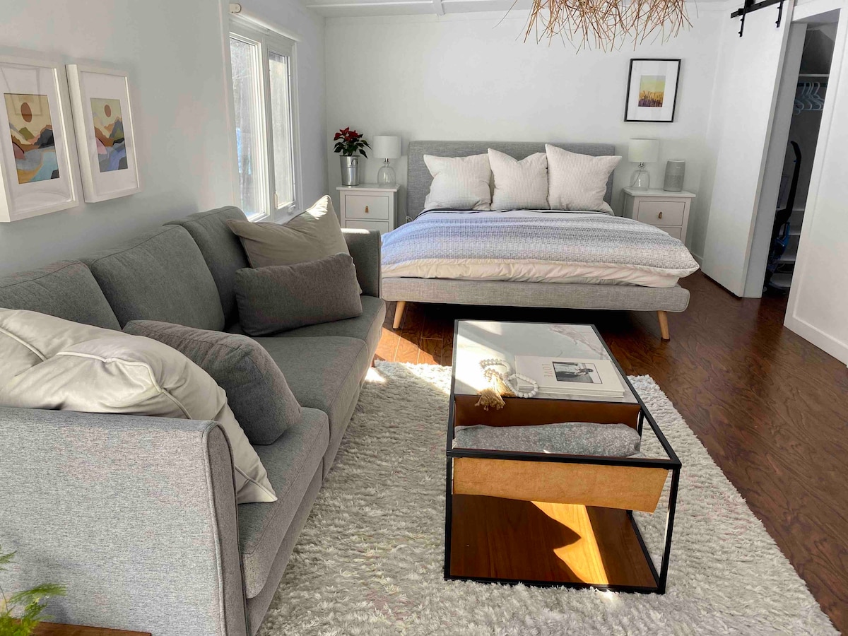 Un espacio sereno, encontrarás el refugio ideal para rejuvenecer y desconectar del ajetreo del día. El ambiente acogedor, bien iluminado y cómodo revitalizará tu espíritu. Esta zona de huéspedes de nueva construcción cuenta con toques y comodidades contemporáneas como wifi de alta velocidad, un secador de toallas, sábanas frescas y una lujosa cama tamaño queen, creando un refugio hogareño. Los huéspedes disfrutarán de la privacidad de su dormitorio, un baño personal de 3 piezas, una cocina totalmente equipada y un espacio de trabajo dedicado.