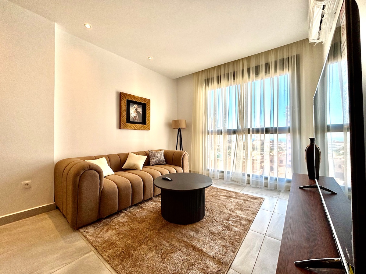 Magnifique appartement avec vue panoramique sur la mer, Cet appartement spacieux et lumineux se compose de : 2 grandes chambres confortables 1 lit King size 1 lit double (180 cm) Un grand salon avec vue sur mer à 180°, baigné de lumière naturelle Une cuisine américaine moderne entièrement équipée Une salle de bain avec douche à l’italienne Parking privé sécuriser en sous-sol, agent 24/7, camera de surveillance, accès contrôlé avec bip Une aire de jeux pour enfants ainsi qu’un espace détente