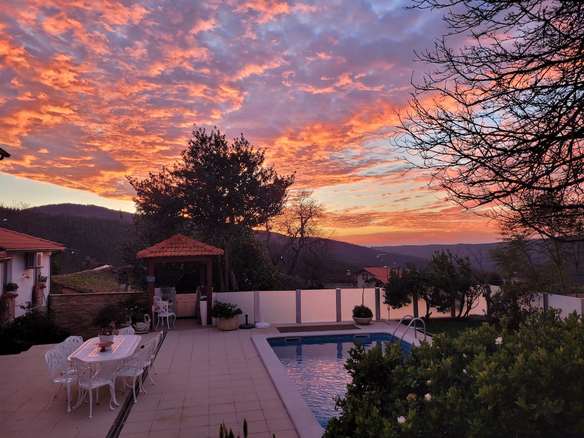 Nosso Chalé está inserido numa quinta vedada, com 3 hectares, situada dentro do Parque Natural da Serra da Estrela. Sitio calmo e tranquilo onde se pode apreciar a natureza e observar a fauna local, através de passeios pelo pinhal, ou optar seguir a ribeira até sua nascente. Também pode relaxar na nossa piscina. Ideal para descansar com a família ou amigos. Aceitamos todos os animais. A quinta, o Chalé, o jardim e a piscina são para uso exclusivo dos hóspedes.