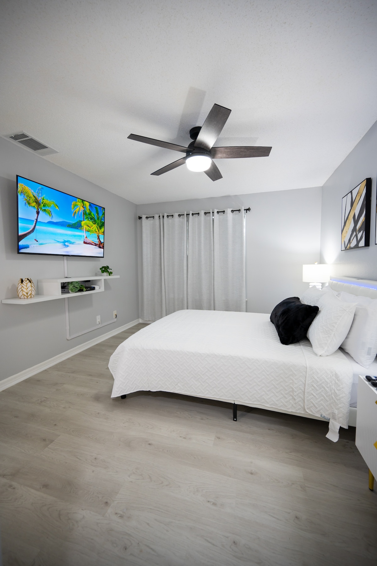 Suite privada y cómoda de 1 dormitorio/baño en una casa adosada de 2021 con ventanas con vista frontal, cama tamaño queen, ducha a ras de suelo y entrada privada. Equipado con ventiladores de techo y portátiles, TV inteligente Roku, mininevera/congelador, microondas y Keurig. Ubicado en un barrio seguro, tranquilo y transitable. A 5 minutos de las tiendas de College Park, a 10 minutos del centro de Orlando, a 25 minutos de Universal Studios, a 30 minutos del Aeropuerto Internacional de Orlando y a 40 minutos de Disney.