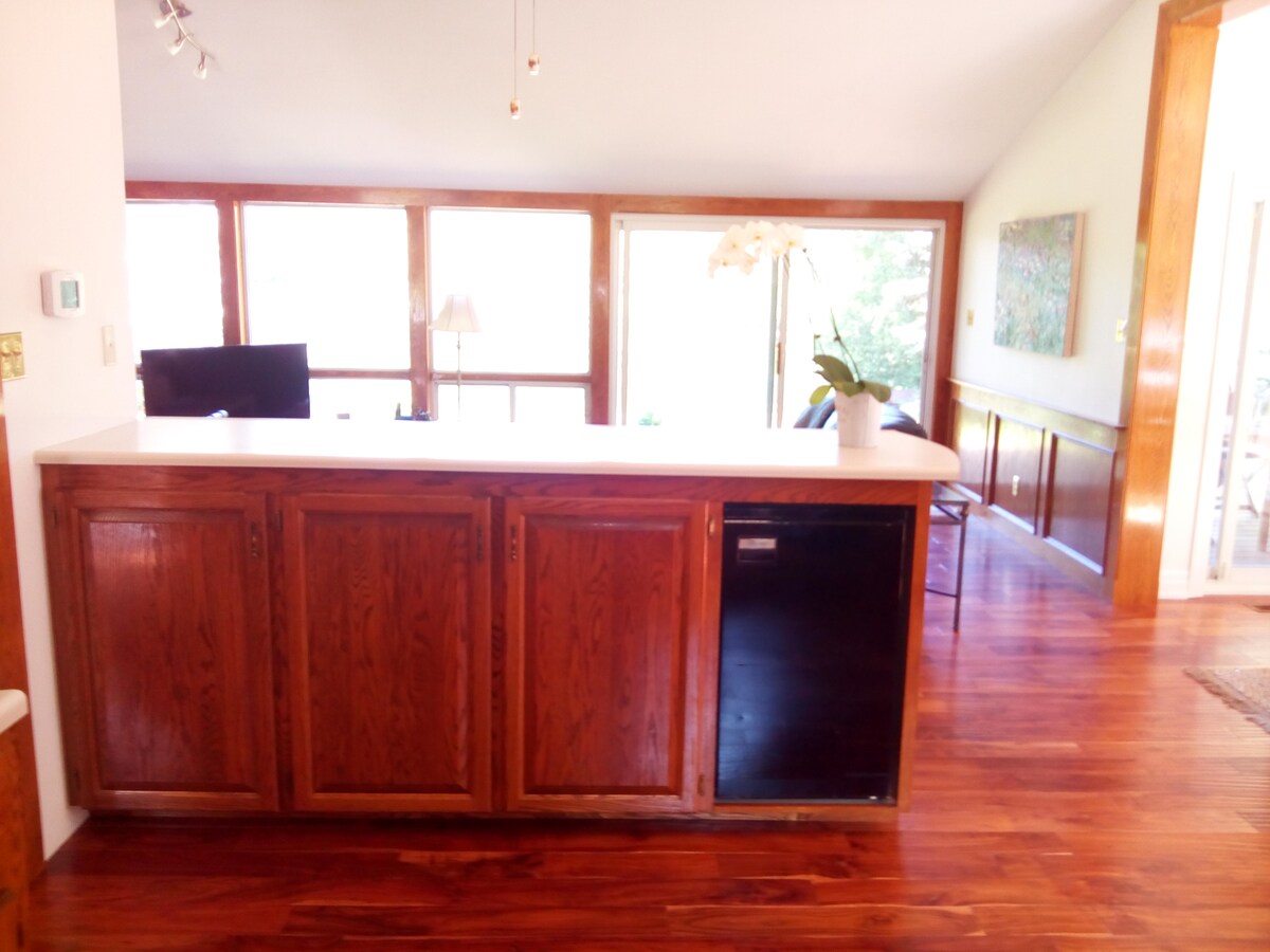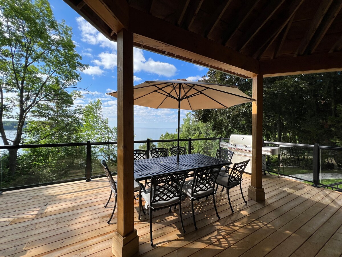 ¡Ven y quédate en nuestra casa de campo frente a la playa, bellamente renovada y para *toda temporada*, y disfruta de una impresionantes vistas panorámicas de la bahía Georgiana! Descubrirás la casa de campo situada en la cima de una duna de arena, justo en una de las playas de agua dulce más impresionantes del mundo. Esta rara ubicación alberga una terraza cubierta privada que se cierne sobre la arena blanca, en una casa de playa más cerca de la bahía que en cualquier otro lugar. Los huéspedes de verano también disfrutan del uso de una piscina climatizada de agua salada y una gran terraza del centro vacacional creada por Paul Lafrance.