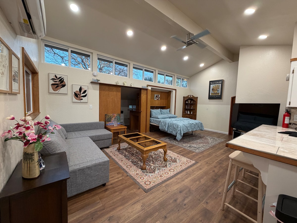 Amplio apartamento con una gran habitación en las tranquilas estribaciones del campo de California. ¡Pueden dormir dos y está cerca de todo! ¡Tiene un dormitorio privado y una gran habitación principal con un cómodo sofá junto a una chimenea de gas! En la habitación principal hay un televisor de 65 pulgadas y en el acogedor dormitorio uno de 43 pulgadas. Ubicado a pocos minutos de Grass Valley/Nevada City y del hermoso centro de Auburn. ¡A 15 minutos de la autopista 80 y a poco más de una hora de Truckee y Tahoe! Lavandería disponible, estacionamiento en la unidad, zona de estar afuera.