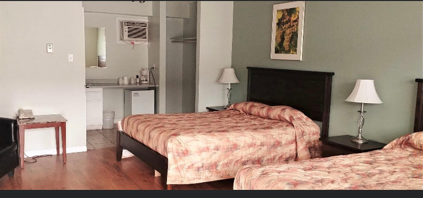 Welcome to our Double Studio, the perfect choice for vacationing in our splendid area. Our Suite offers a flat panel T.V., a cozy Double bed, a four-piece en suite, a convenient mini-fridge, and a coffee maker. Our air-conditioned suites are equipped with cable TV and WIFI, allowing you to stay connected and entertained. Take advantage of our inviting common courtyard, complete with a BBQ area, where you can unwind with a glass of wine.