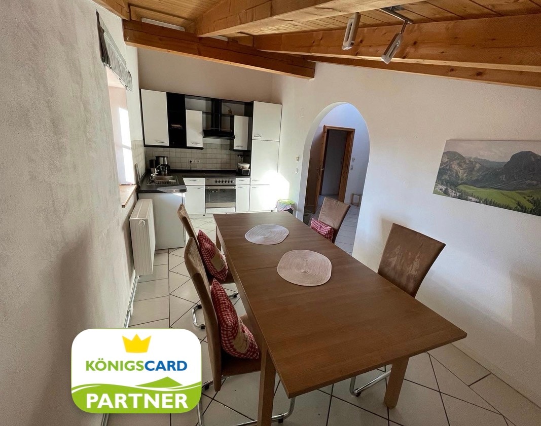 El apartamento, amorosamente amueblado e inundado de luz, con su propia entrada desde el jardín, se encuentra en una casa de asentamiento en el Halblech. Tiene 43 metros cuadrados, la sala de estar y el dormitorio no están separados por una puerta. El apartamento es adecuado para parejas o familias con hasta dos niños. Una cama doble, 180 x 200, y un sofá cama 140 x 195 ofrecen mucho espacio. La pequeña cocina está equipada con una placa de inducción, nevera y fregadero.