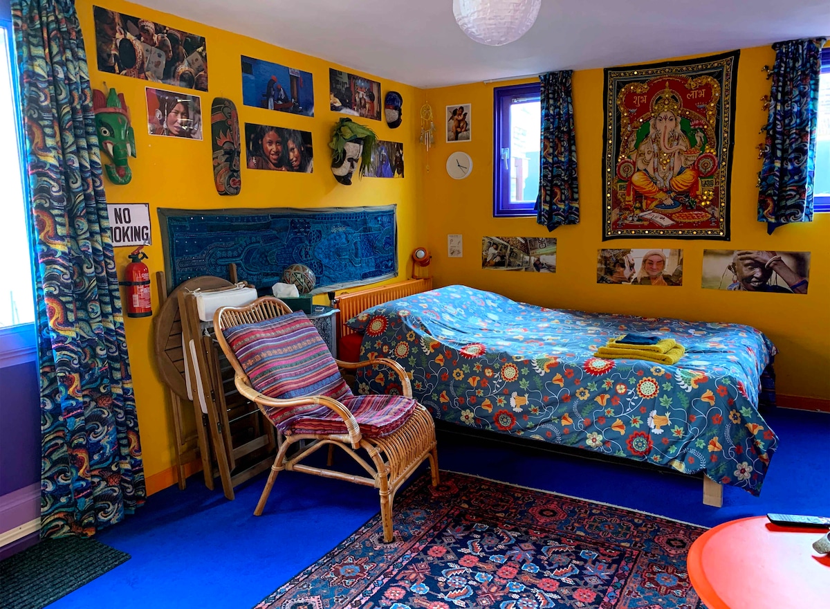 ¡Ven a alojarte en una casa flotante! Ofrecemos una casa de huéspedes privada con un gran comedor/salón (incluye un cómodo sofá cama para 2 personas) y un aseo separado en la planta superior. Abajo hay una cama tamaño queen con vistas al agua y baño con ducha y bañera grande. Una terraza en frente con varios asientos y un banco columpio. Situado en una hermosa calle verde muy cerca del centro: a 2 paradas en tranvía o a 15 minutos a pie de la estación central. No servimos el desayuno, pero proporcionamos muchos productos básicos para que puedas prepararlo tú.