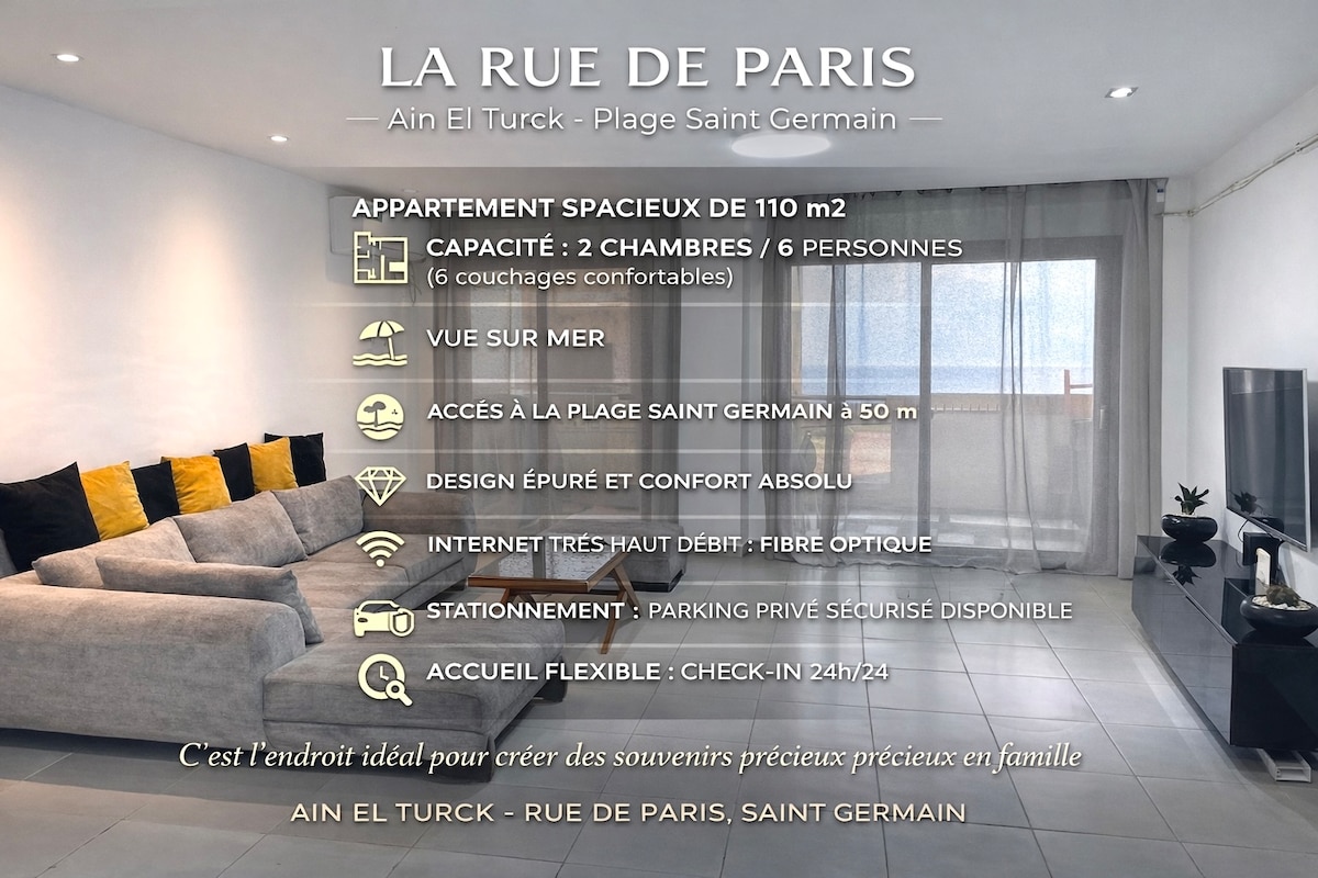 Profitez en famille de ce fabuleux logement neuf et paisible avec vue sur mer 🌊. Cet appartement de 110 m² à Ain El Turck est entièrement meublé et équipé : terrasse face à l'eau, à 50m de la plage Saint Germain 🏖️ et 100m du rond-point El-Chems . Les points forts : • 🌐 Internet Très Haut Débit : Fibre Optique (60 Mbps). • 🚗 Stationnement : Parking privé sécurisé disponible à 200m. • 🔑 Accueil flexible : Check-in 24h/24 grâce à mon collaborateur sur place. N'hésitez pas à me contacter. 🙂