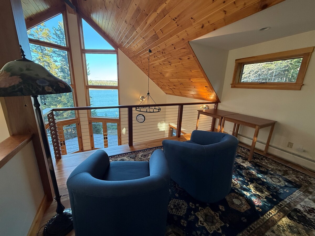 Seascape is a contemporary oceanfront home located on the banks of Penobscot Bay in scenic North Deer Isle. This A-frame house boasts a wall of large, west-facing windows that flood the space with natural light, highlighting the home’s original design and craftsmanship. Enjoy the stunning views from many of the home's interior spaces, the seaside yard, or the wraparound deck while vacationing at Seascape.