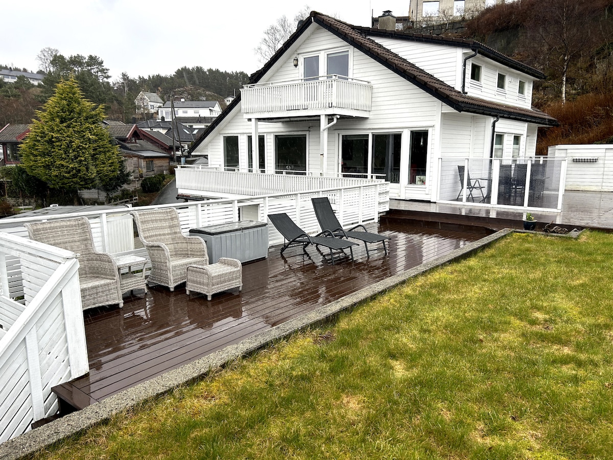 Casa grande con garaje. 5 autos pueden estacionarse de forma gratuita en la parcela. Parcela grande y protegida con una vista fantástica. La casa se encuentra orientada al suroeste con vistas al fiordo y a la entrada a las montañas. Situado en el centro de Alver/Bergen/mongstad. A 25 minutos de las montañas. Parada de autobús y restaurantes a 5 minutos de la casa. La casa tiene 4 dormitorios más una habitación con sofá cama. 2 salas de estar con TV, baño con bañera y esquina de ducha, una Área exterior con jacuzzi /sello de leña y muebles de exterior Se puede alquilar un barco. 22 pies/6 personas (debe reservarse con antelación)