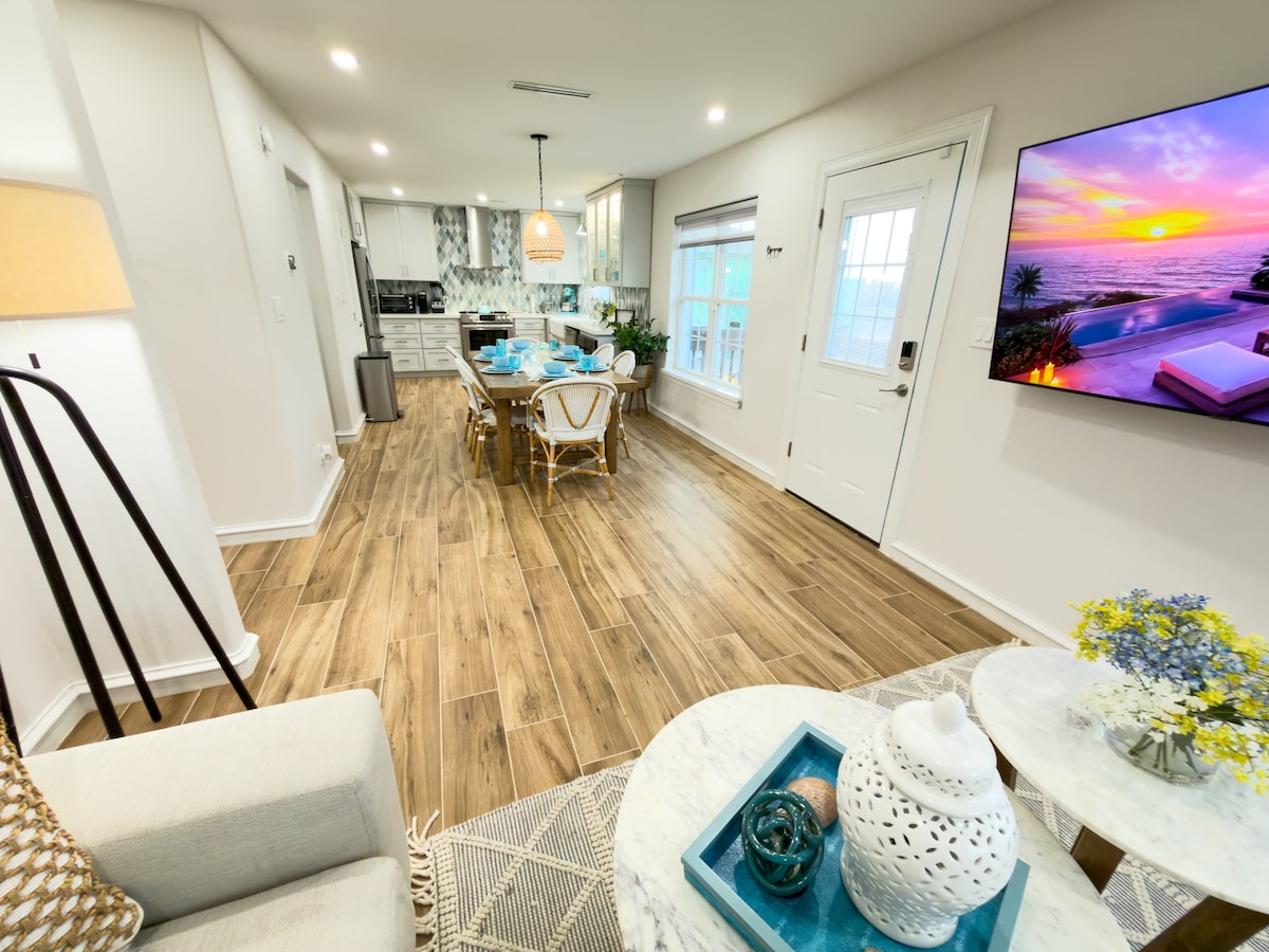 A pocas casas de la playa. Esta hermosa y cómoda casa tiene todo lo que necesitas para relajarte con amigos o familiares. Patio privado fuera del dormitorio con vistas al agua, lavadora y secadora en la unidad, escritorio para trabajo de oficina remoto y justo al otro lado de la calle de la arena. No fumadores, no se permiten mascotas. No hay piscina. “Definitivamente una experiencia increíble y estaba muy cerca de la playa, restaurantes y áreas comerciales. El balcón es súper espacioso y ambos televisores son televisores inteligentes...”