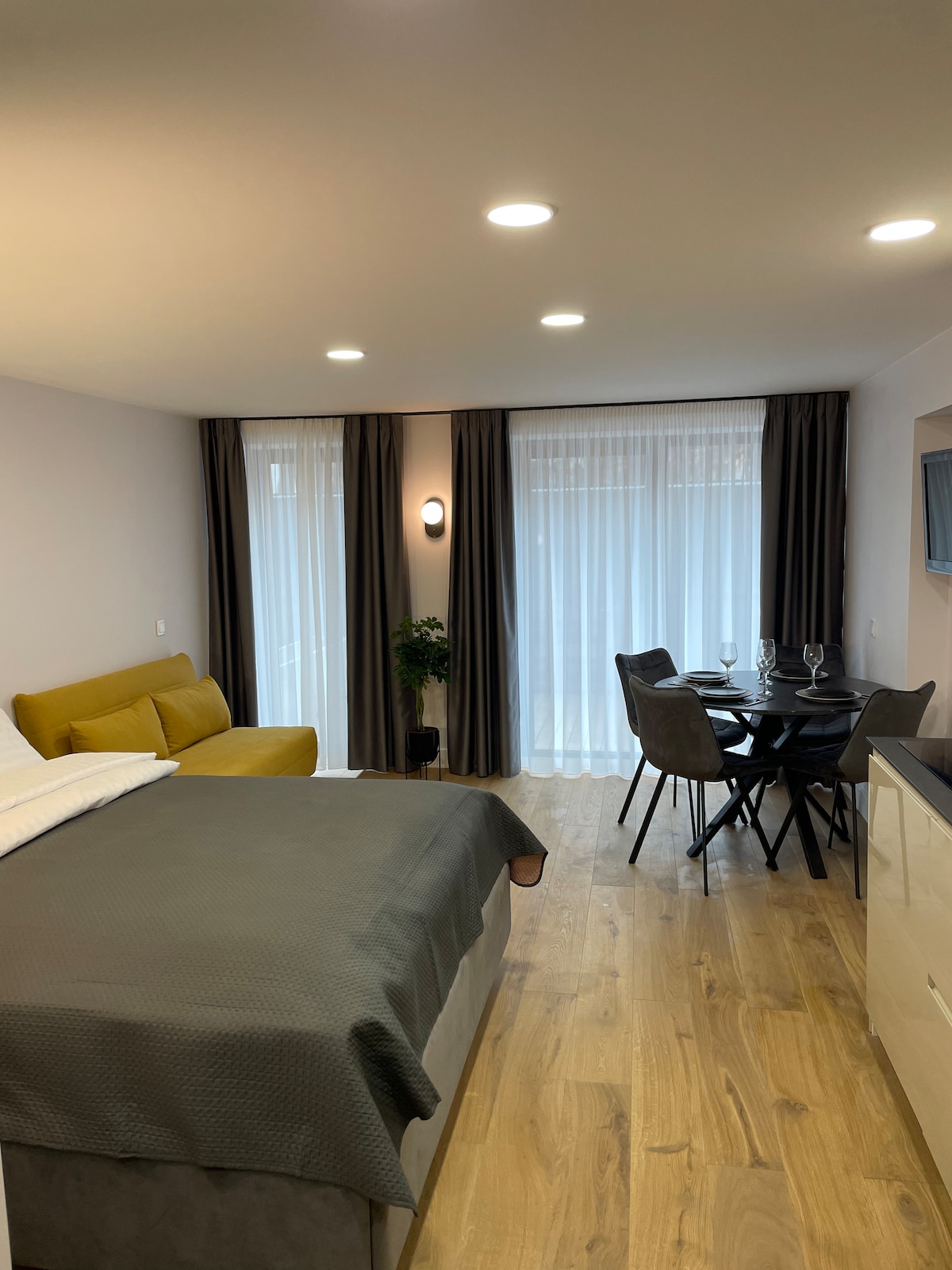 Apartamento nuevo de un dormitorio en el corazón de Palanga, Daukanto Street 8. Disfruta de un amplio salón, una cocina totalmente equipada y una terraza al aire libre. Perfecto para parejas o familias de hasta 4 personas. ¡Playa, calle principal y cafeterías a solo un corto paseo!