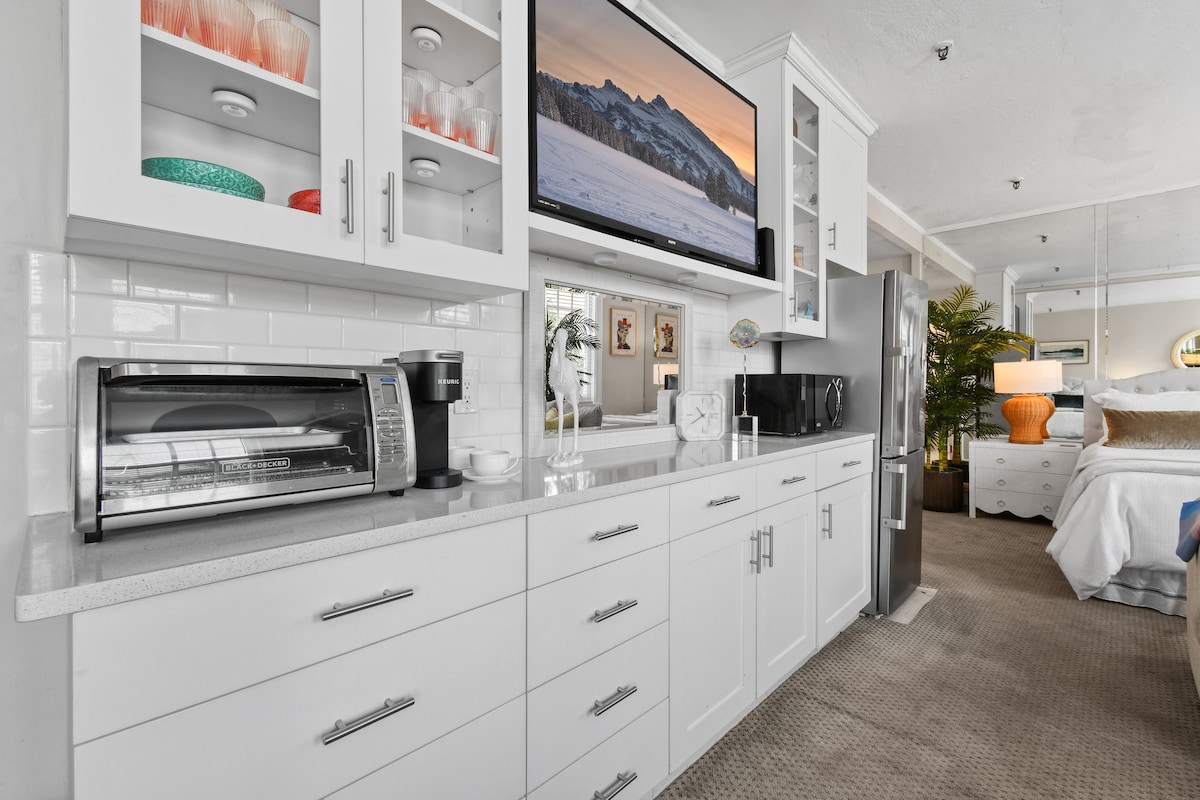 La acogedora Chic Beach Queen, inspirada en la decoración moderna de mediados de siglo, incluye una ducha/bañera y un escritorio de tareas. Este histórico condominio de Palm Beach Hotel está a solo 1 cuadra y media de la playa o relájate junto a nuestra piscina climatizada. Restaurantes de clase mundial a poca distancia a pie. No se necesita auto, pero el estacionamiento valet cuesta $ 15 al día desde las 8:00 a. m. hasta las 11:00 p. m. Por favor, informa si traes un auto y estaciona en frente durante 15 minutos solo para hacer el check-in y pide un letrero de estacionamiento en el buzón 3018. Devuelve el cartel cuando te vayas o te aplicamos una tarifa de 50 $.