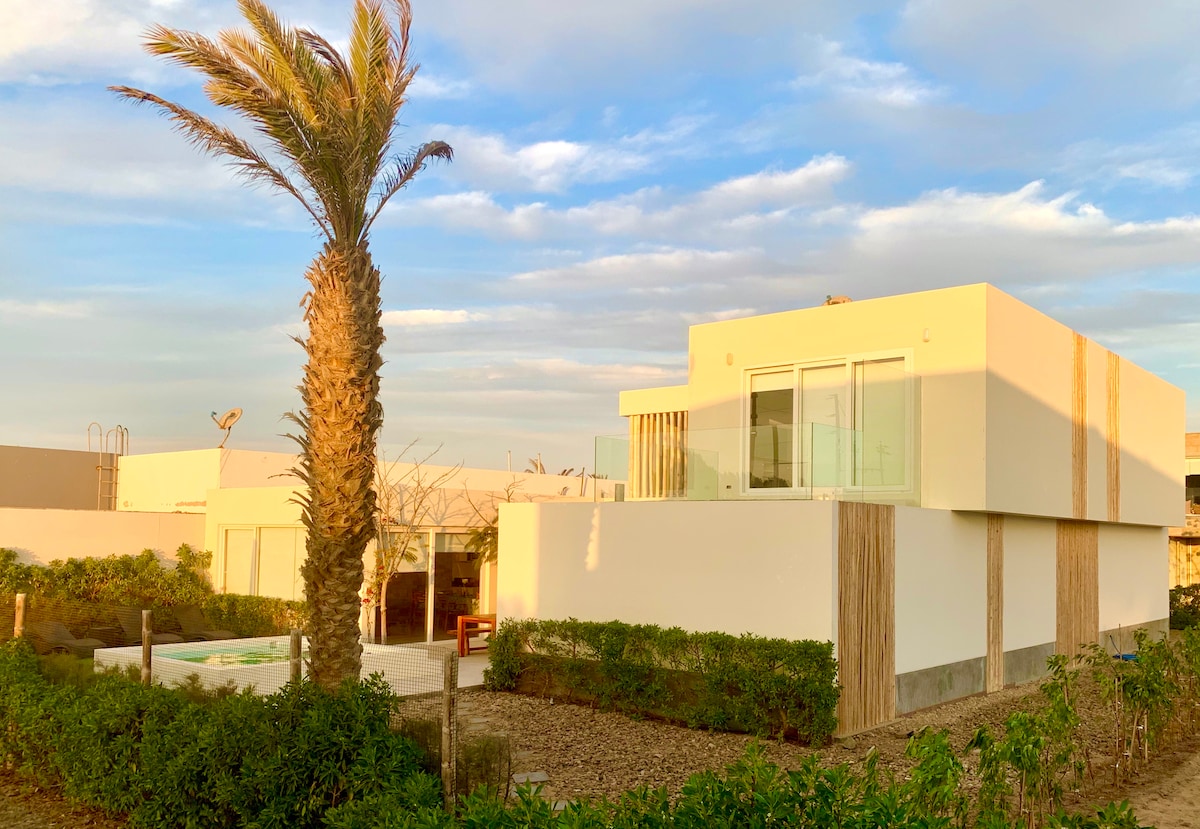 Modern and bright, luxury house, with beachfront pool, just steps away from the ocean. Housekeeper and private Chef included! Located in one of the most beautiful natural reserves in South America (Paracas) - a beach oasis in the middle of the desert, surrounded by a national parks and centuries of pre-Inca history, and 1 hour away from the Nazca lines! 3 spacious bedrooms with en-suite bathroom and closet, TV room, modern kitchen, laundry room, and a bedroom for service staff, a true gem!