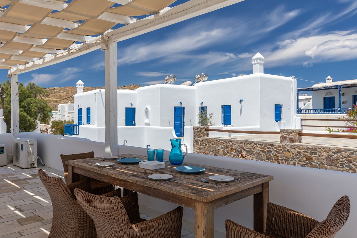 Welcome to our charming studio complex in Mykonos, located near the beautiful Ornos Beach.Our comfortable studios accommodate 2 to 4 guests and are ideal for couples, families or small groups of friends.Each studio features a private bathroom, a small kitchenette with cooking utensils, and a private balcony or terrace with table and chairs the perfect spot to relax and enjoy peaceful evenings after a wonderful day at the beach.A comfortable and welcoming base for exploring the beauty of Mykonos.