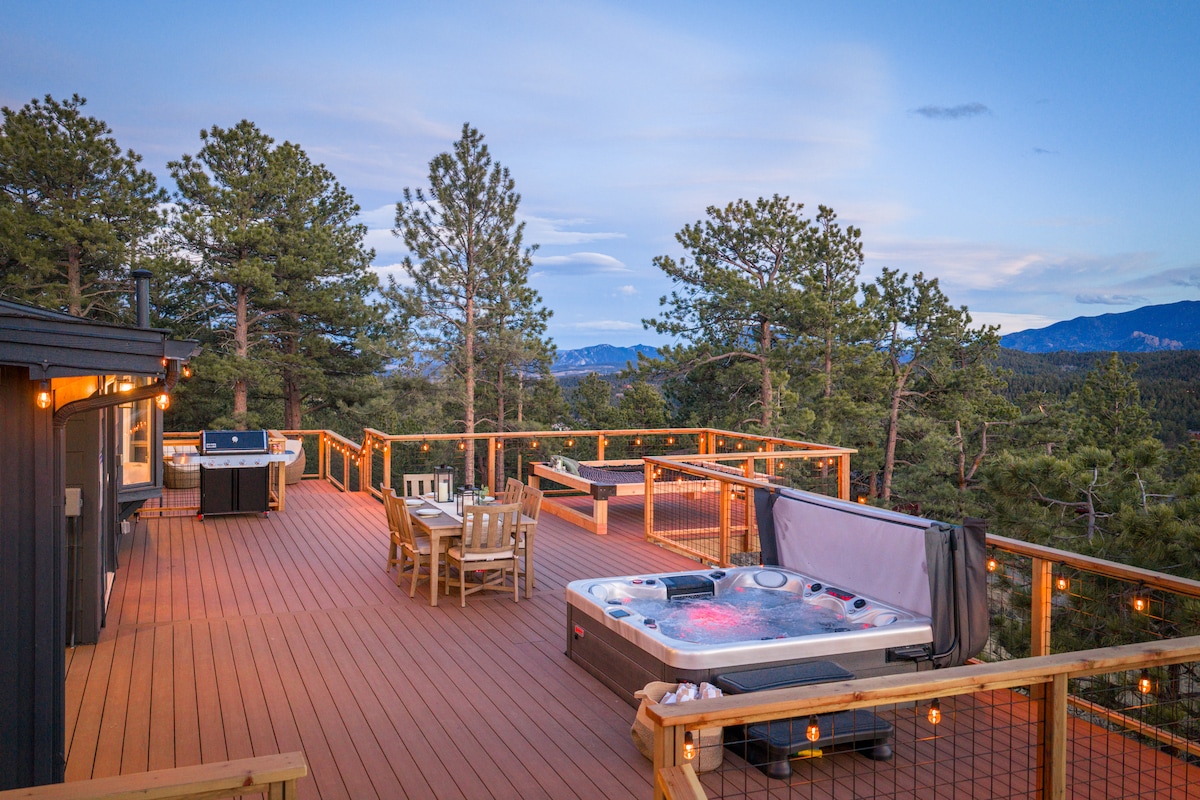 Escápate a 2 acres de tierra privada en la montaña en este tranquilo y espacioso refugio de Conifer. Disfruta de unas vistas impresionantes desde varias terrazas, incluida una terraza independiente en la cima de la roca, perfecta para practicar yoga o meditación. Relájate en la bañera de hidromasaje, reúnete en la sala de juegos o transmite en dos televisores inteligentes. Privacidad total sin vecinos, a solo 10 minutos de restaurantes y tiendas, y a poca distancia en coche de Red Rocks y el centro de Denver. Principales servicios: • Bañera de hidromasaje • Sala de juegos • Dos televisores inteligentes • Lugar de fogata • Terreno privado de 2 acres • Garaje para 2 autos