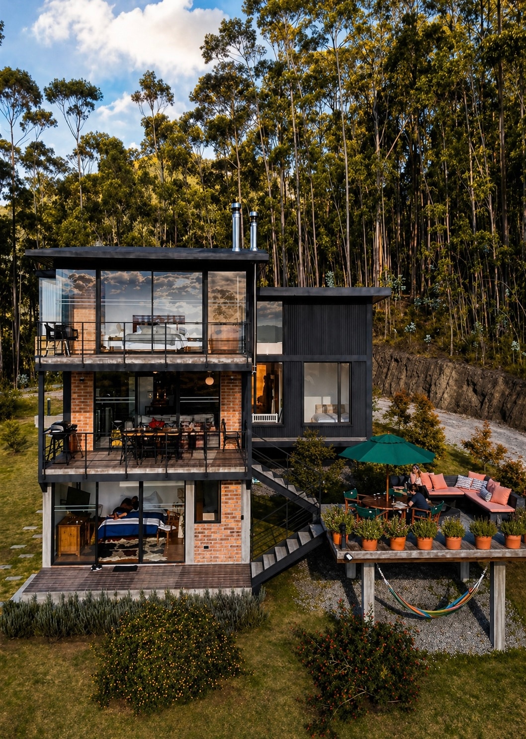 Welcome to an incredible retreat nestled in the highlands of Ecuador. Illu Kuru, meaning "House of Wood" in Quichua and Telugu (India), is a designer masterpiece crafted from stunning black wood. This unique house can comfortably accommodate up to 12 guests, making it perfect for family gatherings, group getaways, or retreats. With 2 mirror sides joined by a spacious common living and dining area, Illu Kuru offers both privacy, communal spaces and nature 20 minutes away from Ibarra, Ecuador.