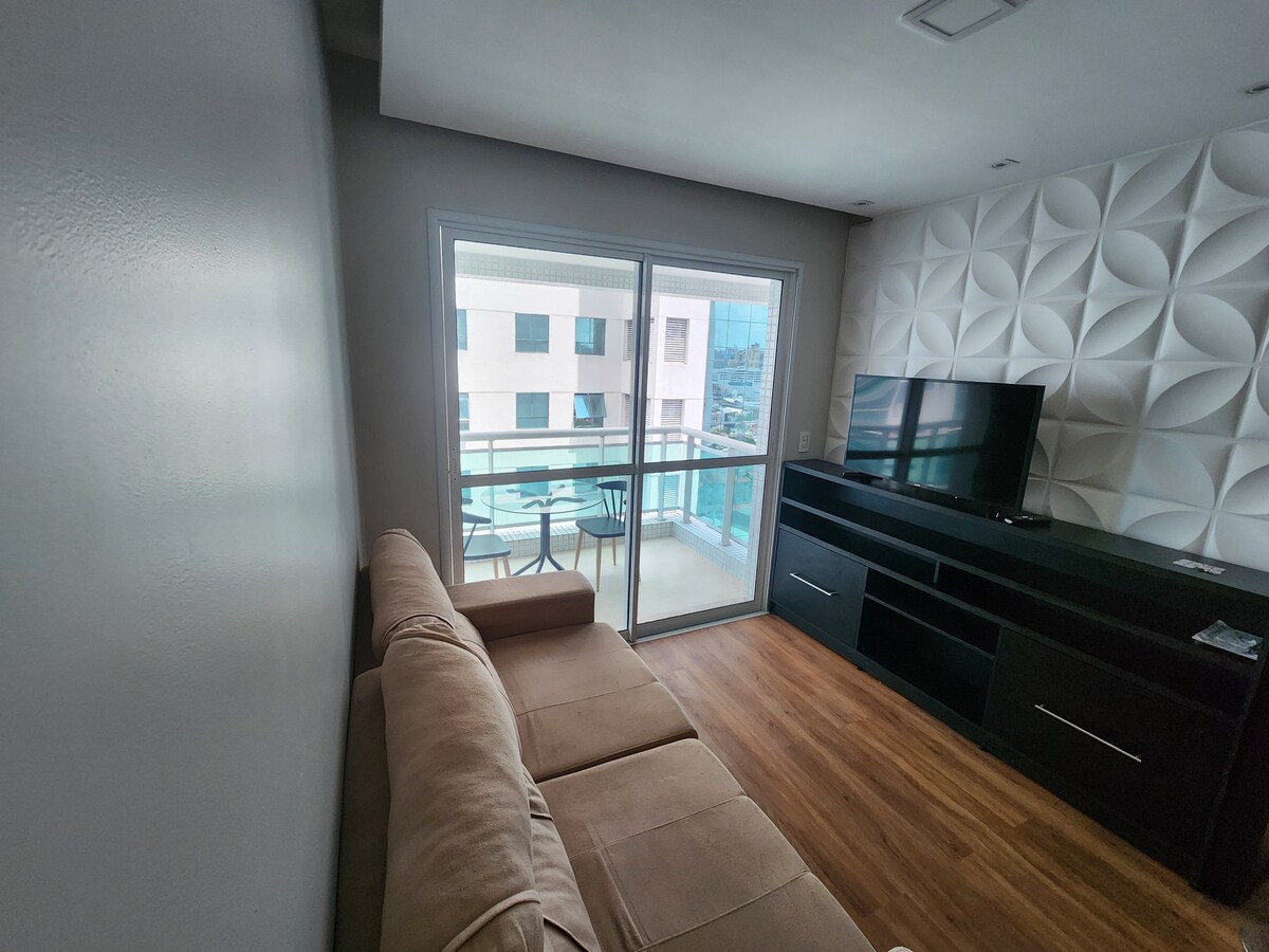 1 quarto, 1 banheiro, sala ampla e cozinha integrada. Piso de taco espinha de peixe renovado. Banheiro reformado, porcelanato de primeira e chuveiro elétrico bom. Máquina de roupa lava e seca. Ar condicionado e ventilador de teto no quarto, um jogo de roupa de cama e banho. Cozinha equipada com eletrodomésticos, louça básica e utensílios de cozinha. Com projeto de Iluminação. Tv 65". Internet Wi-Fi. Estacionamento pago a poucos metros de distância da portaria, que é 24 horas.