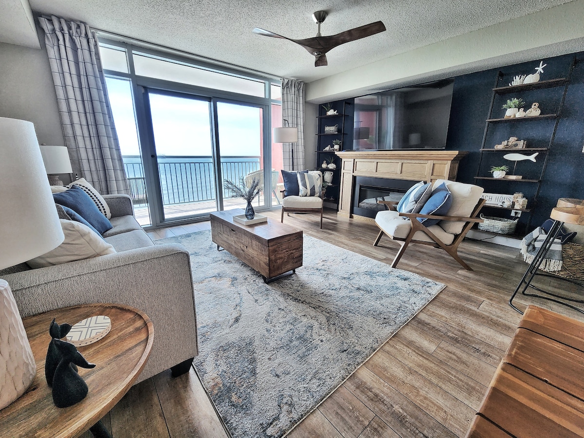 ¡Destacado en «Beach Front Bargain Hunt» de HGTV!- ¡Hermoso apartamento frente al mar, recientemente renovado, a pie de playa! Tanto la sala de estar como el dormitorio tienen vistas al mar. Hay una cama tamaño king en el dormitorio principal y una cama tamaño king en el segundo dormitorio. 3 televisores, uno en cada habitación y un televisor grande en la sala de estar. Hay una cama abatible y un sofá cama. Cerca del nuevo muelle, tiendas, restaurantes y campos de golf. Hay 1 cámara de seguridad en la pasarela que conduce a la puerta principal. Siempre está encendida.