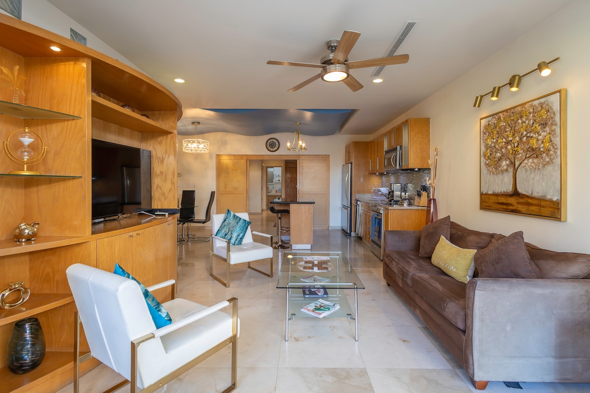 ¡Bienvenido a nuestro impresionante apartamento con vistas incomparables del icónico Arco de Cabo San Lucas! Ubicado en una ubicación verdaderamente única en el corazón de la ciudad, nuestro lujoso refugio ofrece una combinación perfecta de comodidad, estilo y conveniencia. Te cautivarán las vistas panorámicas del Arco y las aguas azules del Océano Pacífico desde la amplia sala de estar. El apartamento cuenta con una decoración de buen gusto y contemporánea, con muebles elegantes que añaden un toque de sofisticación a cada rincón.