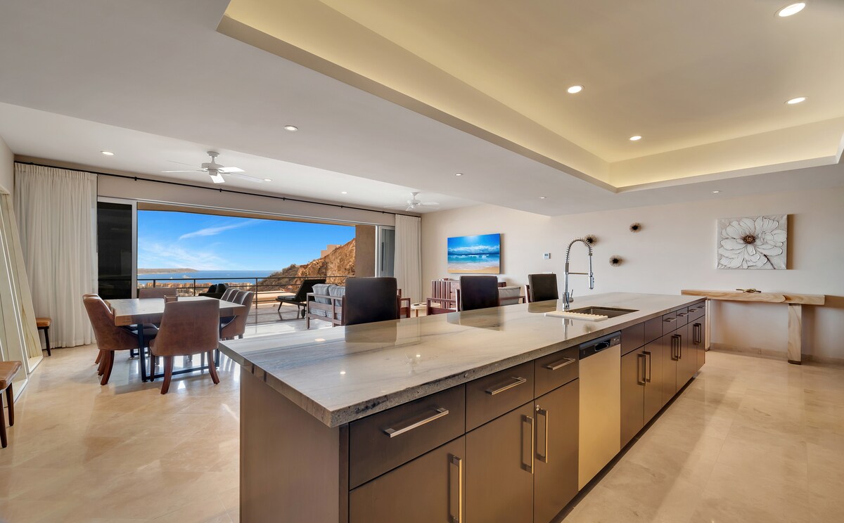 The condo's 180º view lets you enjoy sunrise and sunset at the Cabo Arch from your breakfast-dinner table! Terrace design offers intimacy and escape. Ideal for a romantic stay, home office with paradise views, BBQ dinners with sunset vistas, relaxing hammock siestas, whale-watching while cooking, and sunrise views from bed! Walking access to Cabo's top two beaches and next to The Cape and Thompson Hotel. Please remember, this is a rental condo, not a hotel, and the price reflects that.