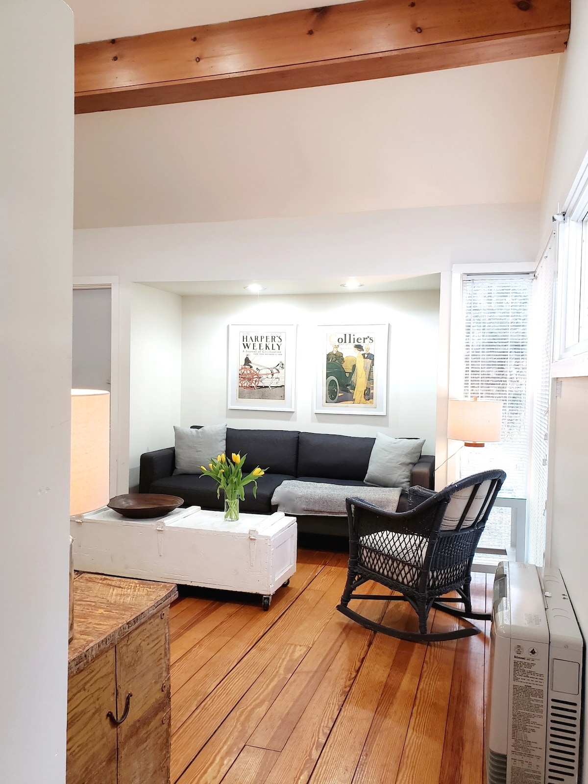 Apartamento recién restaurado en el segundo piso de una casa de 175 años a 2 manzanas del cine Amherst y a pocos pasos de todo lo que este vibrante centro de la ciudad tiene para ofrecer. A poca distancia a pie de Amherst College y UMass. Esta casa conserva el carácter de antaño, pero brilla con nuevos suelos de madera, baño moderno y electrodomésticos nuevos. Pasillo de entrada original con paneles de madera y vigas a la vista en todas partes. Mobiliario antiguo, decoración histórica en las paredes y una cocina soleada con barra de madera reciclada integrada. Pequeño balcón con capacidad para 2 personas.
