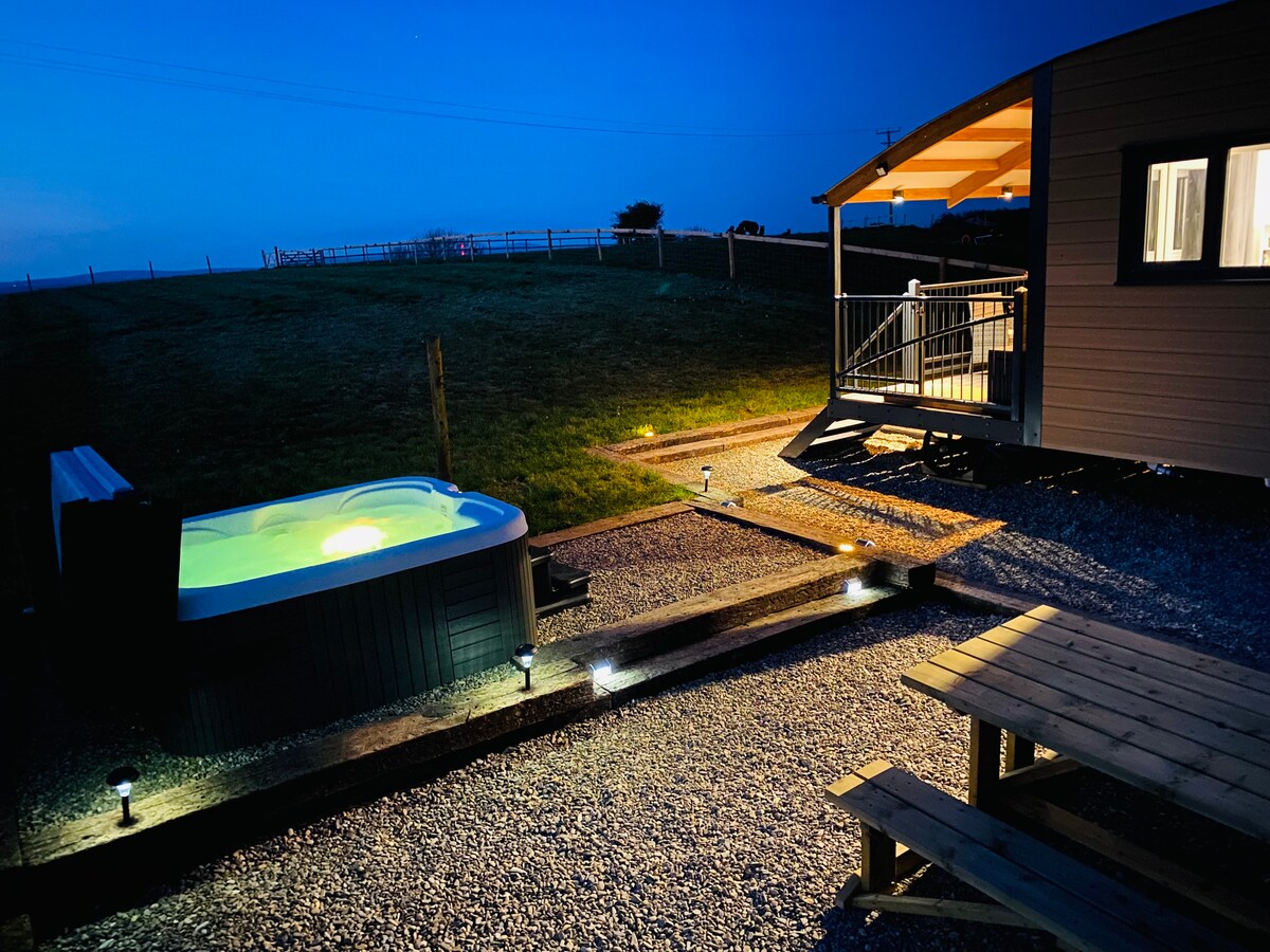 **Carromato de pastor con jacuzzi** Un refugio acogedor y rústico perfecto para parejas en un jardín privado parcialmente amurallado con jacuzzi eléctrico y asientos al aire libre. Esta encantadora cabaña de pastor ofrece calefacción central, wifi de alta velocidad y una cocina de gas para una comodidad moderna. Situado a pocos kilómetros de Milford Haven, es el punto de partida perfecto para explorar el Parque Nacional de la Costa de Pembrokeshire. Disfruta de una escapada romántica rodeada de árboles maduros y vida silvestre en este refugio tranquilo.