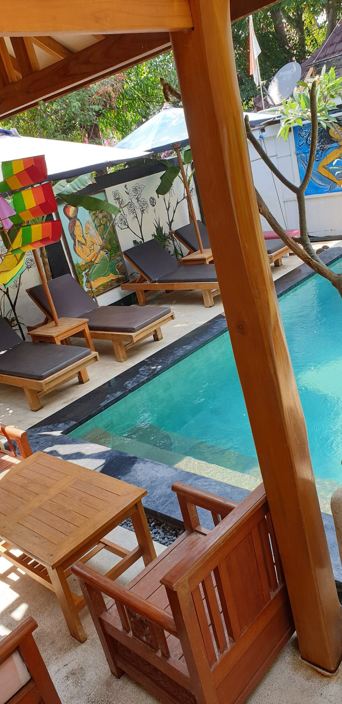 ubicado en medio de Gili Air. Estamos cerca de los principales atractivos de la isla : clases de cocina, restaurante, centros de buceo, playa, zona de esnórquel, supermercado. y ofrecemos una buena velocidad de conexión wifi gratuita en toda la zona