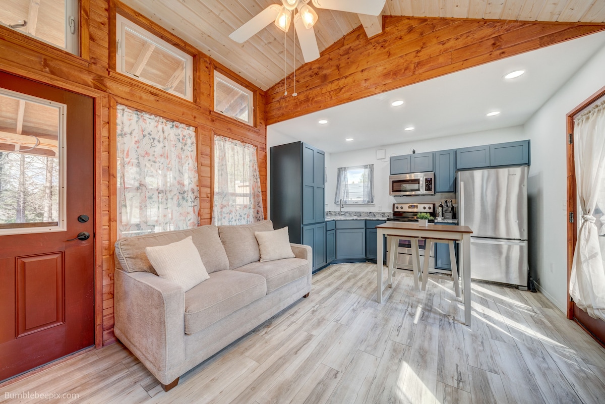 The Bear Hut This newly finished tiny house is absolutely amazing. With everything that you could possibly need to enjoy your stay One bedroom with a full size bed. One loft with queen size bed, another loft with twin size bed plus a futon. Many split air conditioner propane heater plus electric fireplace There's an outdoor barbecue, an outdoor fire pit and seating for your friends and family There's a TV in the living room and in the main bedroom And good wifi Come relax and enjoy yourself!