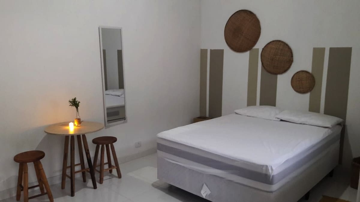 ¡Alojamiento con encanto y encanto, a solo 60 pasos de la paradisíaca playa de Paúba en São Sebastião! Este piso suite para parejas súper equipado es un verdadero sueño: minibar, despensa con microondas, aire acondicionado, ventilador de techo, escritorio, cama queen con resortes embolsados, armario, baño, ducha exterior privada, ¡todo listo para ti! Y para completar la diversión, ¡una refrescante piscina te invita a relajarte y disfrutar! ¡Ven a ser feliz con nosotros!
